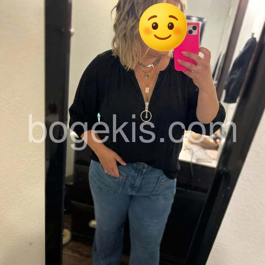 I absolutely love this top! The zipper detail with the large ring is so unique and lets me adjust the neckline perfectly. It looks amazing paired with jeans. Highly recommend!